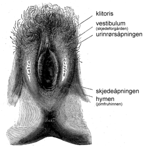 Ytre kjønnslepper (labia majora) omslutter indre kjønnslepper (labia minora) og klitoris. Området innenfor de indre kjønnsleppene kalles vestibulum (skjedeforgården), og i øvre del av denne skjedeforgården finner man urinrørsåpningen. I nedre del av skjedeforgården er skjedeåpningen, og en eventuell rest av jomfruhinnen (hymen) kan i blant sees nedenfor skjedeåpningen.Filhistorikk