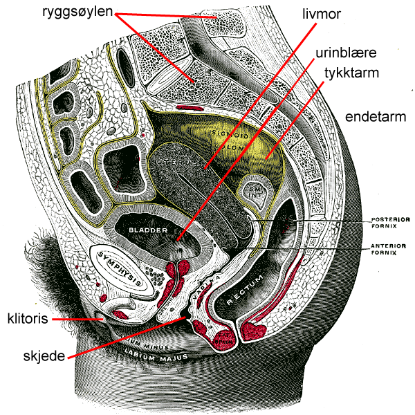 Illustrasjon av indre kjønnsorganer (unntatt eggstokker) hos kvinner (genitalia interna). Fra Anatomy of the Human Body, 1918 (copyright utgått på dato). Modifisert og påført norsk notasjon ved Arne Westgaard. Originaltegning av Henry Gray (1825–1861), lastet ned fra www.bartleby.com.